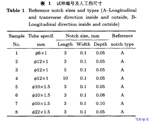 由于鈦合金薄壁管材超聲檢測(cè)具有靈敏度高、檢測(cè)盲區(qū)小、多為自動(dòng)檢測(cè)等特點(diǎn),因此對(duì)儀器設(shè)備的要求同常規(guī)超聲檢測(cè)相比有一定的區(qū)別,通常認(rèn)為,鈦合金薄壁管材超聲檢測(cè)中,人工傷對(duì)超聲波聲束的反射主要是刻槽與基體材料之間的端角反 射,因此人工槽的寬度對(duì)聲束反射影響較小,為了實(shí)驗(yàn)不同尺寸鈦合金管材人工傷對(duì)檢測(cè)結(jié)果的影響,結(jié)合具體應(yīng) 用制作了一組不同深度和長(zhǎng)度人工傷的試樣,試樣編號(hào)及尺寸如表1。